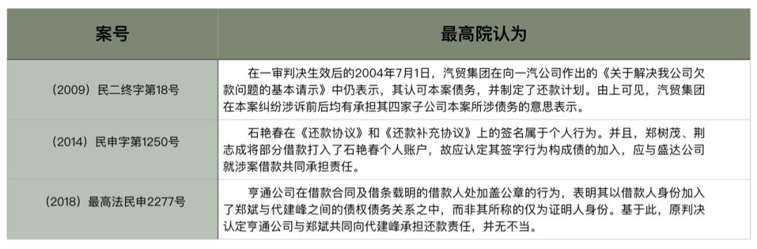 最高院认为:当第三人未明确作出承诺还款的意思表示时,但作出“认可原债务,并制定还款计划”、“在还款协议上签字”、“在借款合同的借款人处签字盖章”等使其获得债务人身份的行为,仍可构成债务加入。
